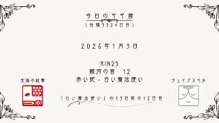 今日のマヤ暦 【今日のマヤ暦】1月3日 KIN25 音12 赤い蛇 – 白い魔法使い こんにちは、マヤ暦鑑定歴13年目の りあん です。「今日のマヤ暦」を日々活用していただきありがとうございます!今日一日の過ごし方「チェックポイント」をお届けします。マヤ暦は、毎日それぞれ違ったエネルギーが流れているという考え方をします。その... 2026.01.03 今日のマヤ暦