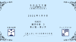 今日のマヤ暦 【今日のマヤ暦】1月9日 KIN31 音5 青い猿 – 青い手 こんにちは、マヤ暦鑑定歴13年目の りあん です。「今日のマヤ暦」を日々活用していただきありがとうございます!今日一日の過ごし方「チェックポイント」をお届けします。マヤ暦は、毎日それぞれ違ったエネルギーが流れているという考え方をします。その... 2026.01.09 今日のマヤ暦