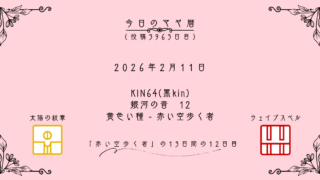 今日のマヤ暦 【今日のマヤ暦】2月11日 KIN64(黒kin) 音12 黄色い種 – 赤い空歩く者 こんにちは、マヤ暦鑑定歴13年目の りあん です。「今日のマヤ暦」を日々活用していただきありがとうございます!今日一日の過ごし方「チェックポイント」をお届けします。マヤ暦は、毎日それぞれ違ったエネルギーが流れているという考え方をします。その... 2026.02.11 今日のマヤ暦