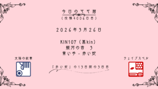 今日のマヤ暦 【今日のマヤ暦】3月26日 KIN107(背骨kin) 音3 青い手 – 赤い蛇 こんにちは、マヤ暦鑑定歴13年目の りあん です。「今日のマヤ暦」を日々活用していただきありがとうございます!今日一日の過ごし方「チェックポイント」をお届けします。マヤ暦は、毎日それぞれ違ったエネルギーが流れているという考え方をします。その... 2026.03.26 今日のマヤ暦