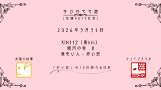 今日のマヤ暦 【今日のマヤ暦】3月31日 KIN112(背骨kin) 音8 黄色い人 – 赤い蛇 こんにちは、マヤ暦鑑定歴13年目の りあん です。「今日のマヤ暦」を日々活用していただきありがとうございます!今日一日の過ごし方「チェックポイント」をお届けします。マヤ暦は、毎日それぞれ違ったエネルギーが流れているという考え方をします。その... 2026.03.31 今日のマヤ暦