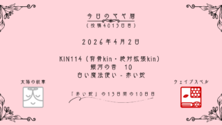 今日のマヤ暦 【今日のマヤ暦】4月2日 KIN114(背骨kin・絶対拡張kin) 音10 白い魔法使い – 赤い蛇 こんにちは、マヤ暦鑑定歴13年目の りあん です。「今日のマヤ暦」を日々活用していただきありがとうございます!今日一日の過ごし方「チェックポイント」をお届けします。マヤ暦は、毎日それぞれ違ったエネルギーが流れているという考え方をします。その... 2026.04.02 今日のマヤ暦